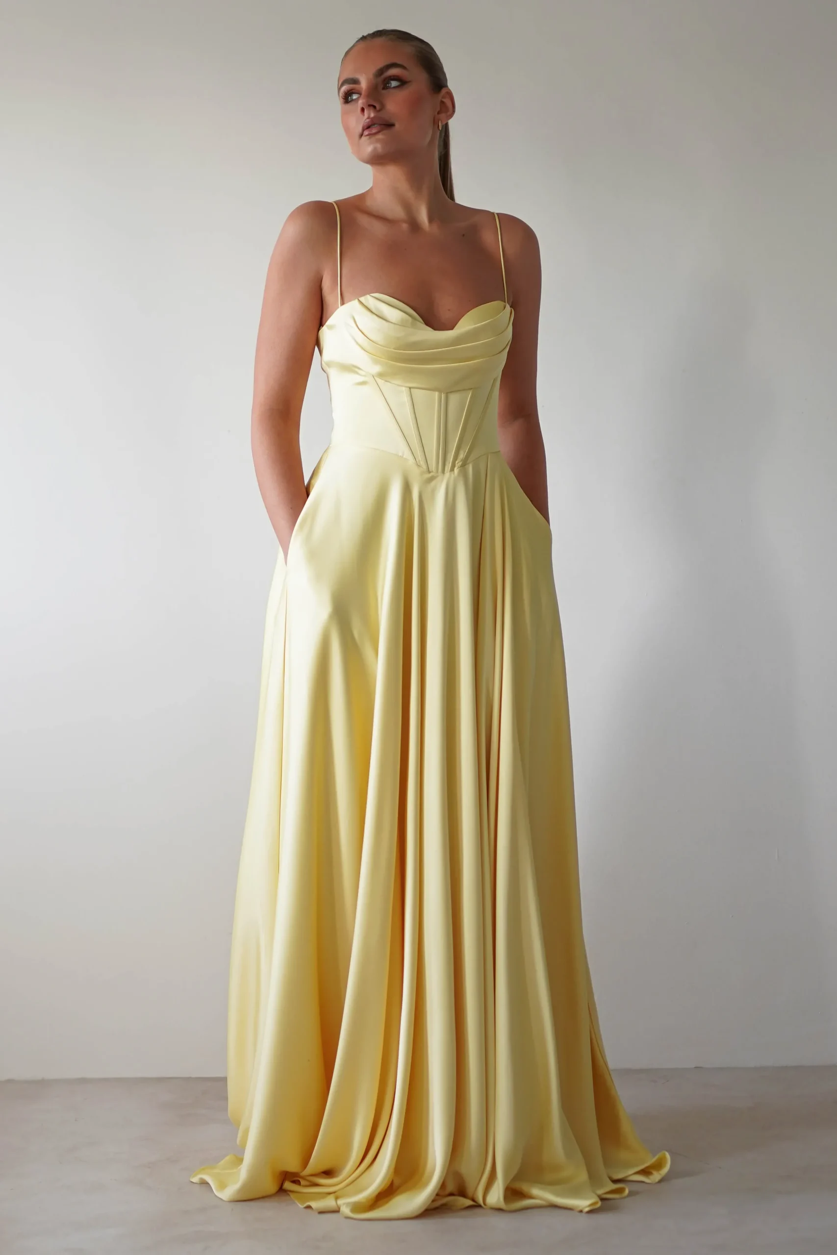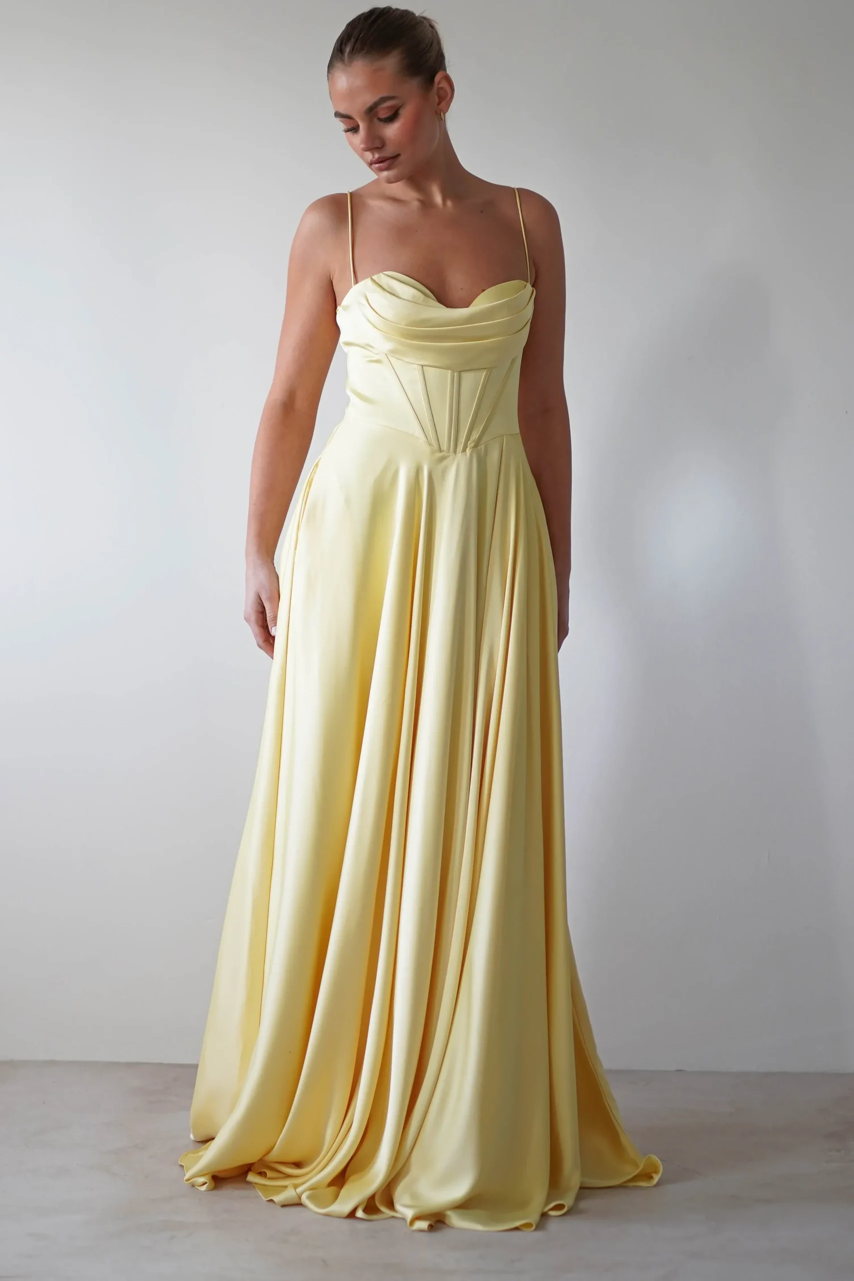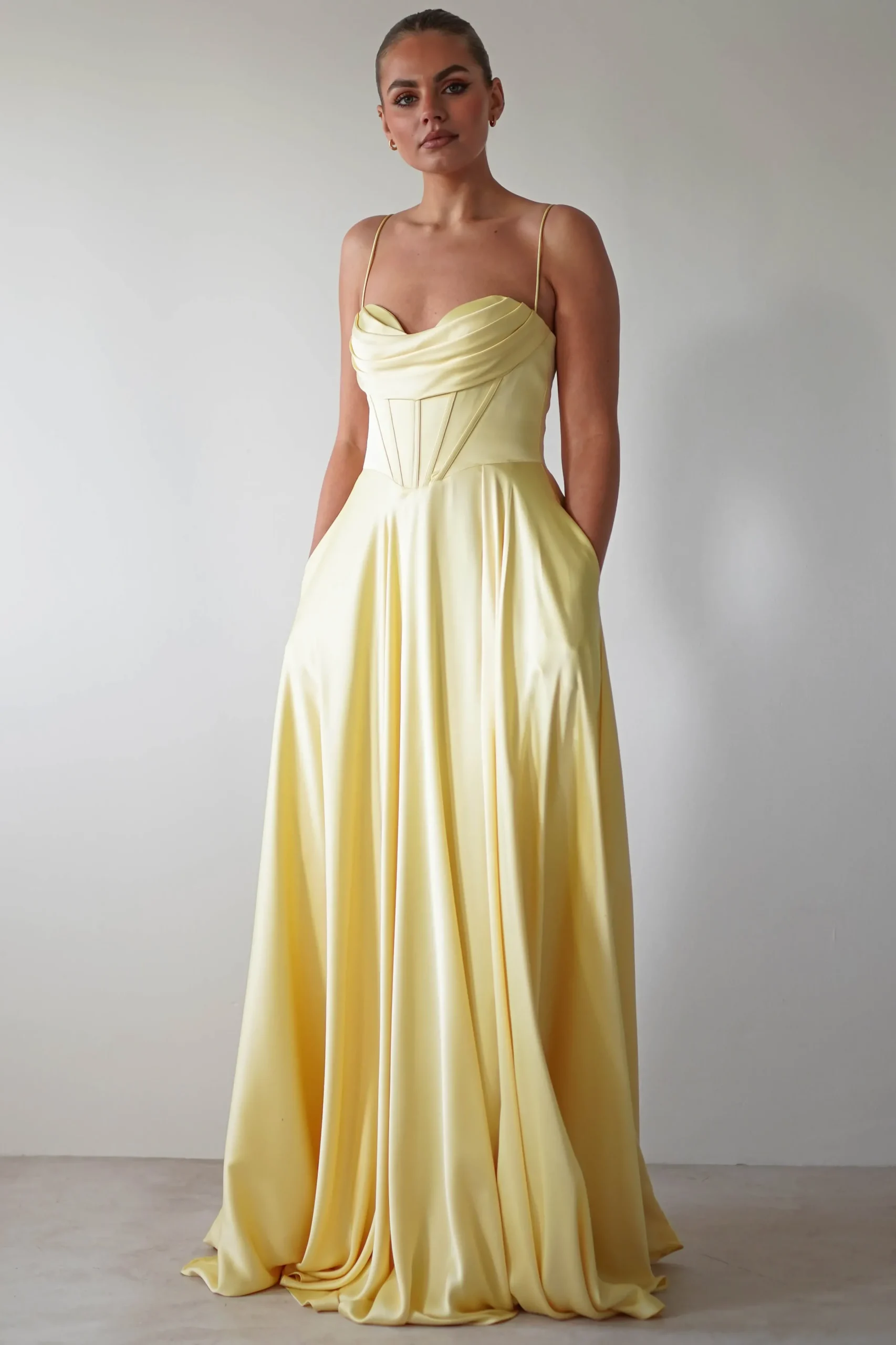 This elegant yellow gown features a flowing A-line silhouette with a draped cowl neckline and delicate spaghetti straps. The structured bodice with subtle corset detailing enhances the figure, while the luxurious satin fabric drapes beautifully, making it the perfect choice for formal events, proms debs, and evening occasions.