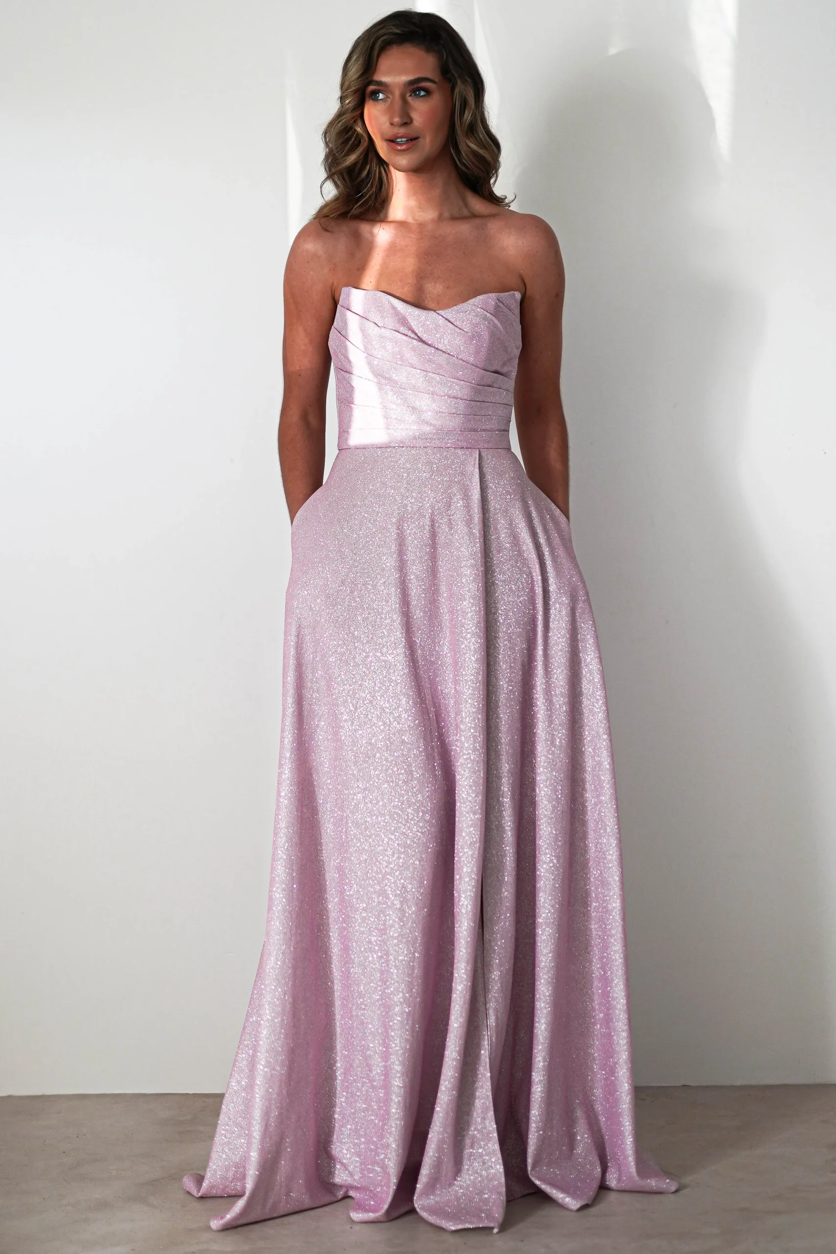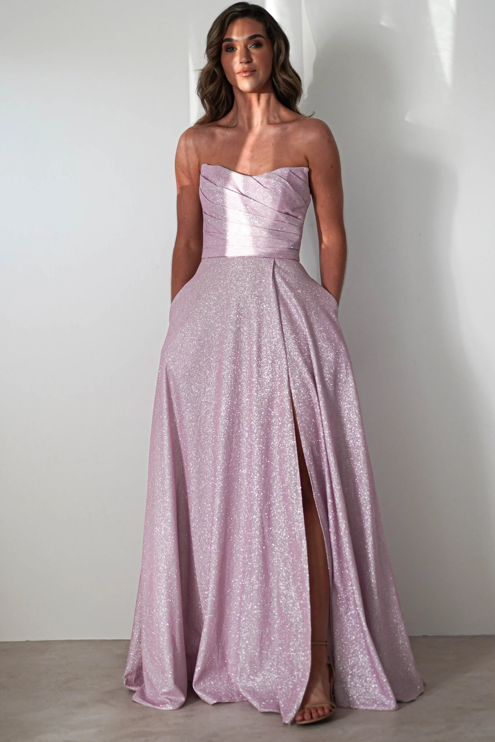This enchanting evening gown features a strapless sweetheart neckline, a shimmering fabric with elegant pleats, and a flowing A-line silhouette with a high slit. Perfect for formal events, debs, prom, galas, and special occasions