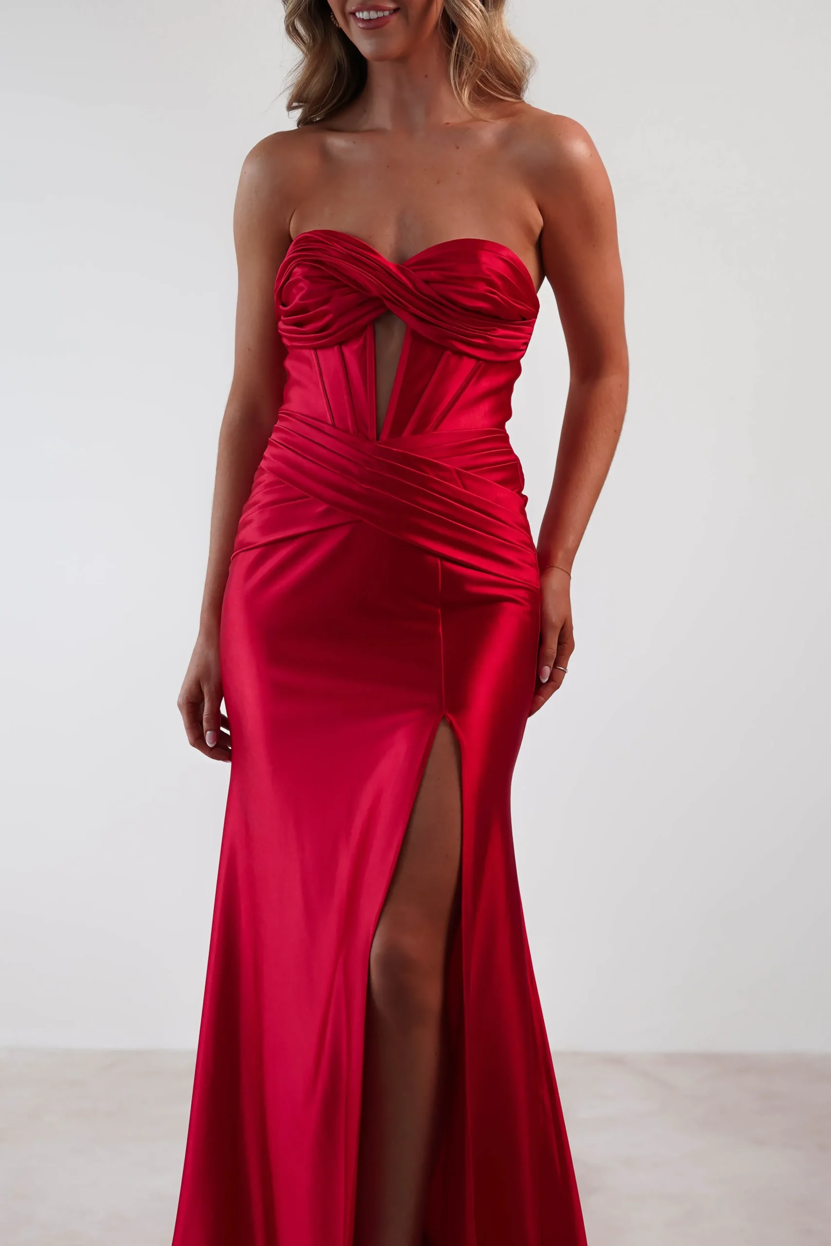 Turn heads at prom or your next special event with this stunning strapless red gown. Featuring a flattering ruched bodice, a daring front slit, and luxurious satin fabric, this dress radiates elegance and confidence. Perfect for prom, debs, or any glamorous occasion.
