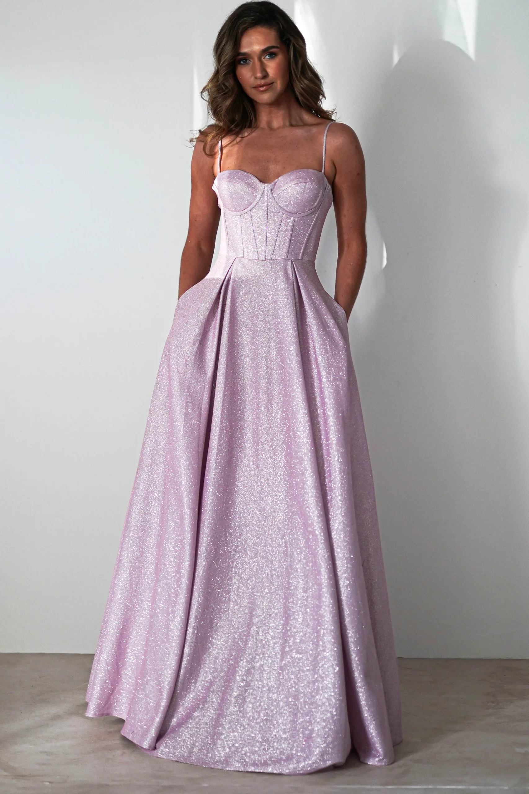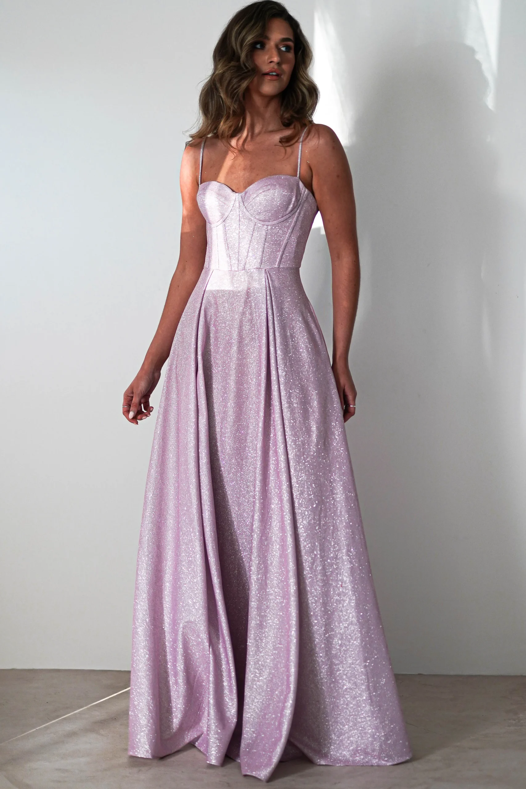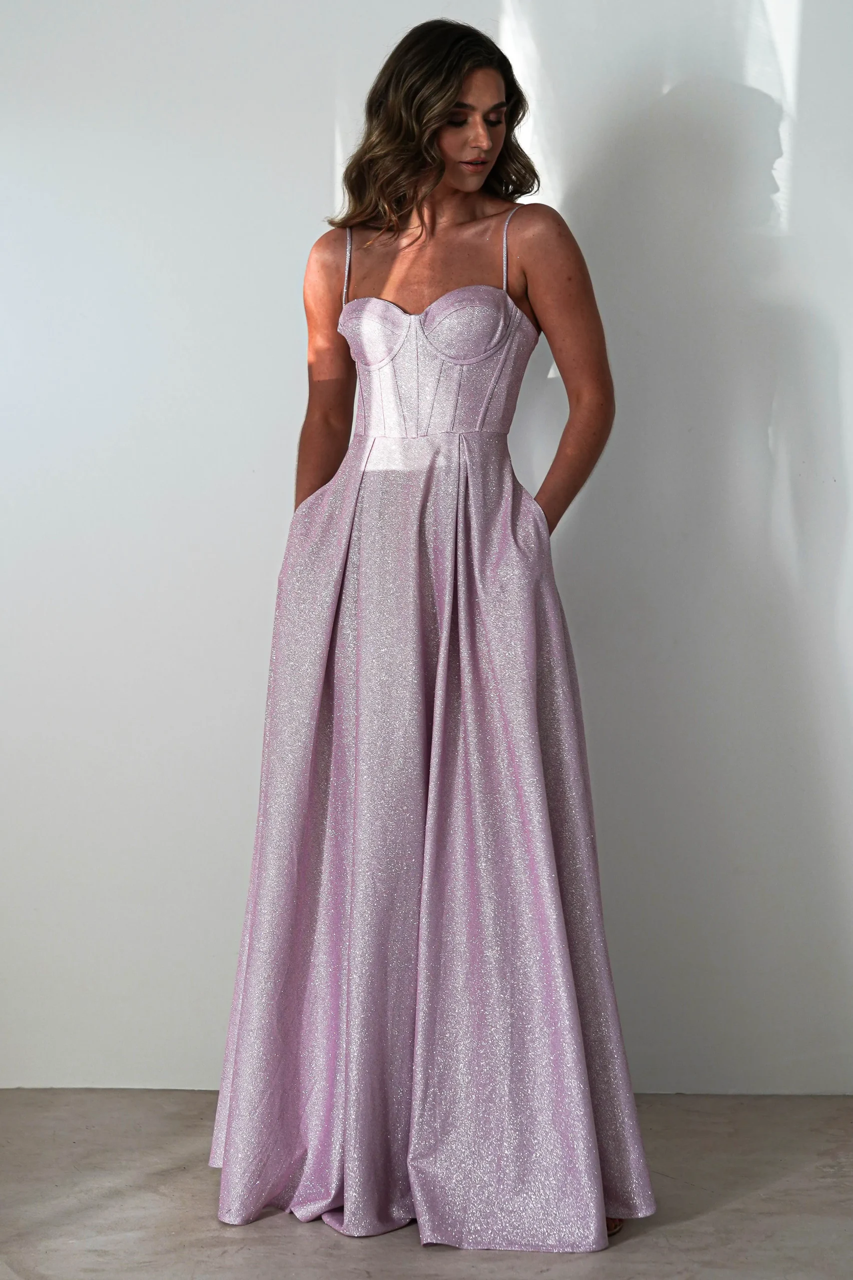 A mesmerizing ball gown featuring a structured corset bodice with delicate spaghetti straps, a shimmering fabric, and a voluminous pleated skirt for a regal and elegant look. Perfect for formal events, debs, prom, galas, and special occasions.