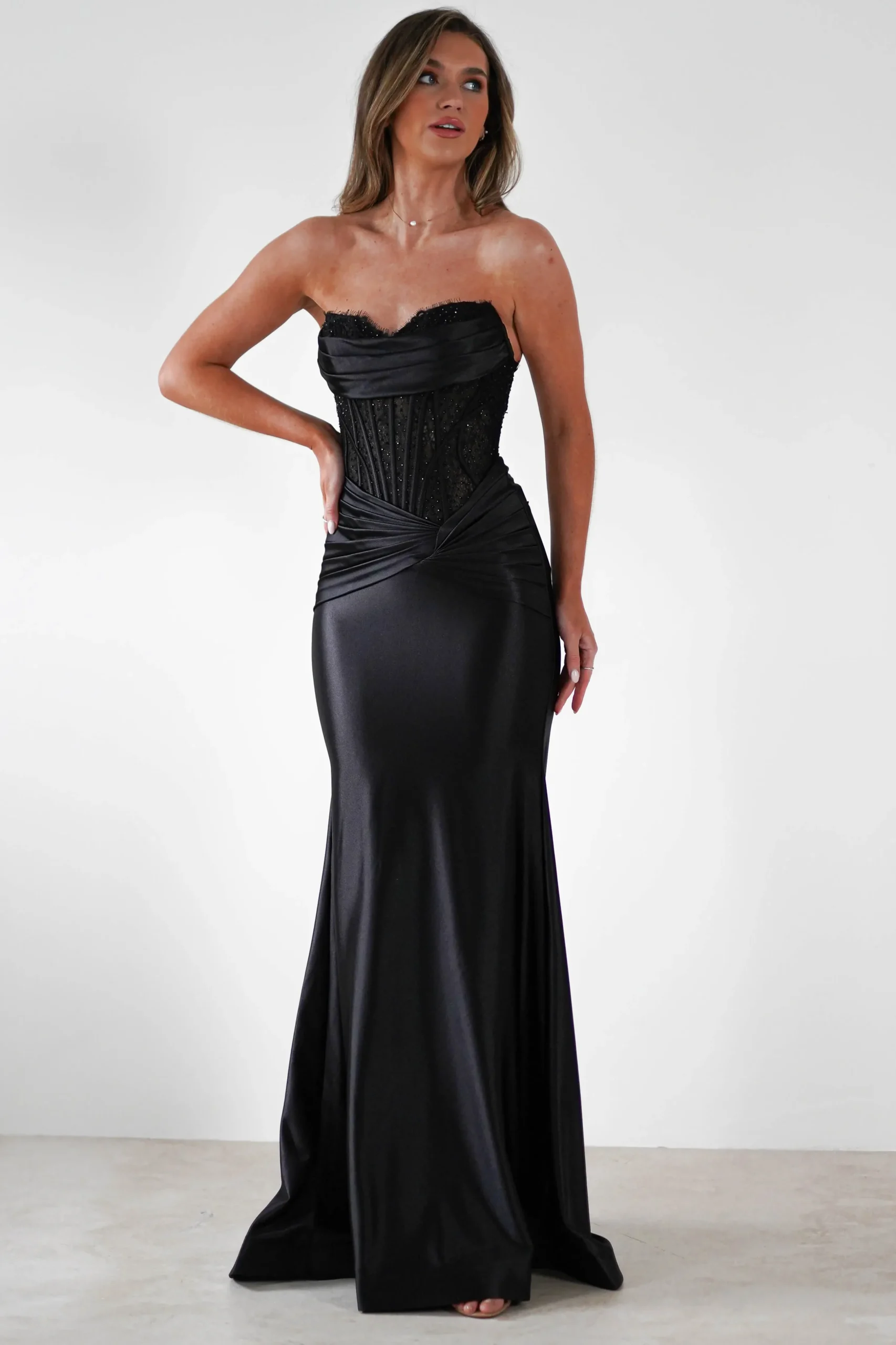 This elegant black evening gown features a structured corset bodice with delicate lace trim, a figure-hugging silhouette, and a sleek satin finish. The strapless design and subtle draping at the waist create a timeless, sophisticated look. Perfect for black tie events, debs and prom.